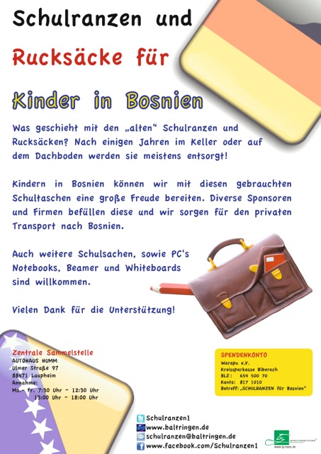 Mehr über die Aktion finden Sie unter www.baltringen.de/Bericht_Bosnien.pdf / Dort werden auch spätestens im September Fotos über unsere Aktion zu sehen sein. Bildung ist eines der größten Güter, die wir Kindern zukommen lassen können. Alle Kinder gehen gerne zur Schule - und das erst recht mit einem tollen Schulranzen.